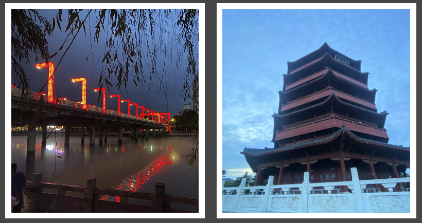 Left: one of the bridges over the Shihe river. Right: It was considered bad luck to live south of the Shihe river. The city consulted a fengshui expert who advised them to build this pagoda. Then the south side could be redeveloped.